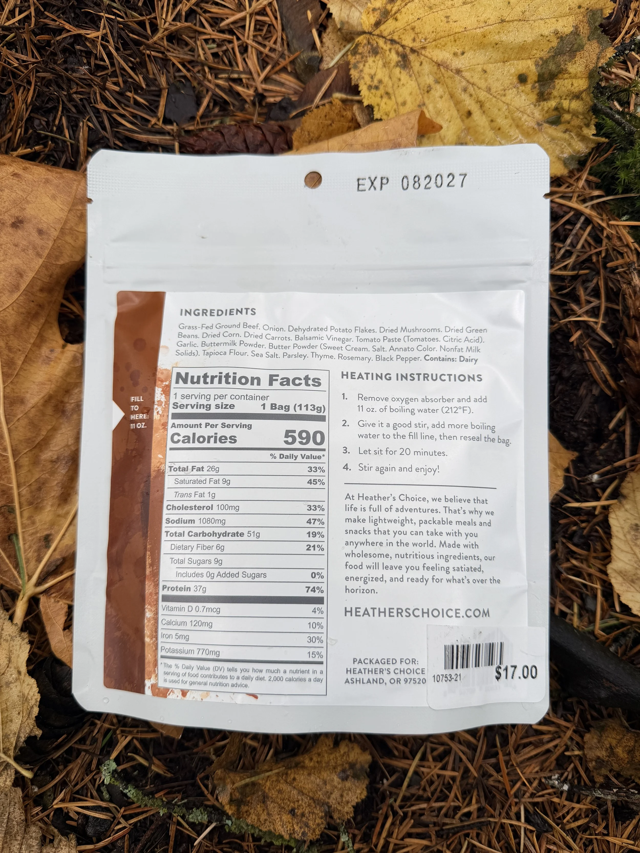 Notes: I was really looking forward to this meal as it did not seem to be full of mashed potatoes which always seem to soak up all the water and provide next to no flavor. Sadly despite adding too much water and giving more than the allotted rehydration time, I was left with a crunchy mess. A bit of Wildfire Co. hot sauce powder did up the flavor a bit but I will still disappointed that such an expensive meal was lacking flavor and proper rehydration. Cheers!