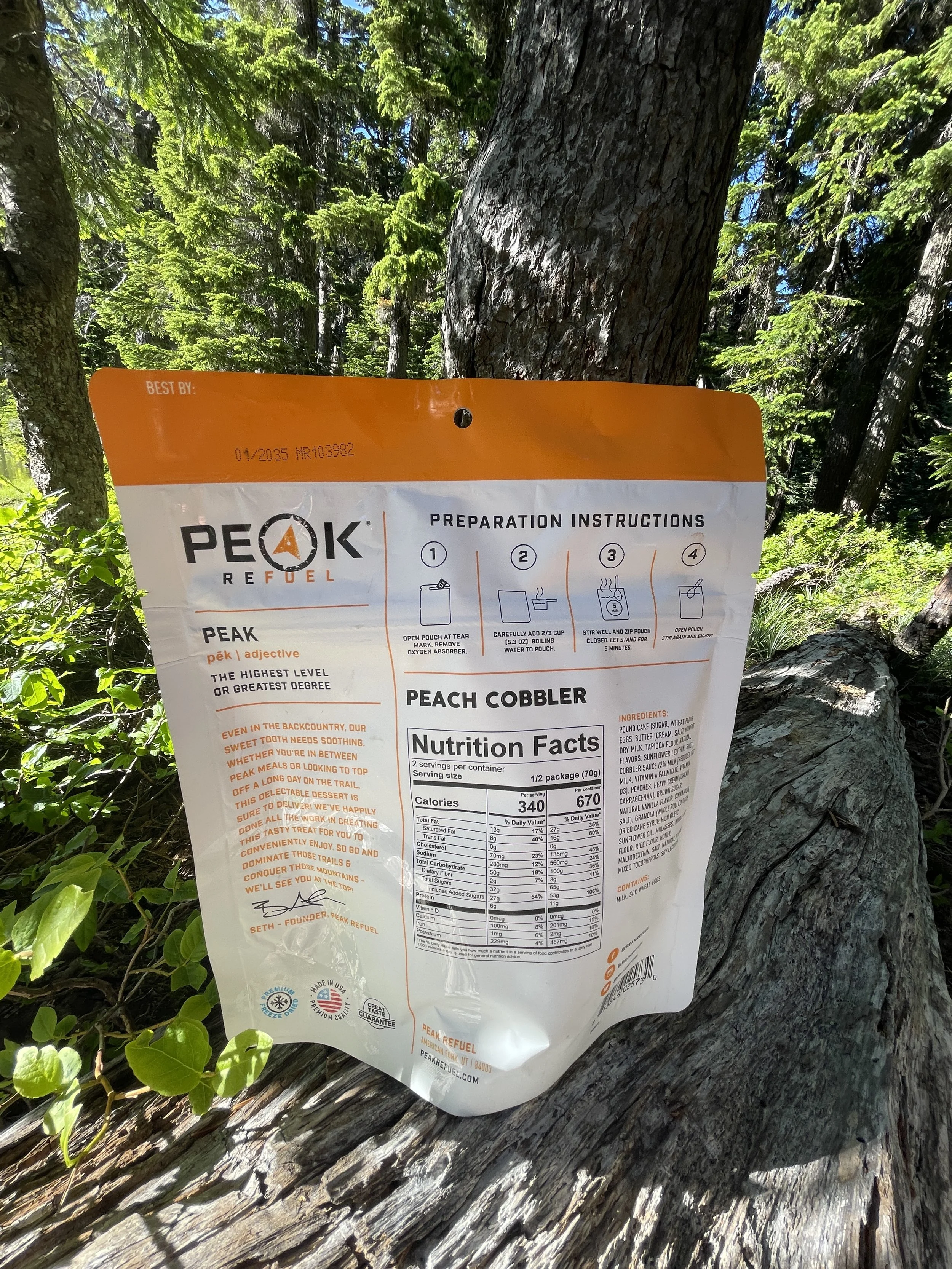 Notes: I had high hopes for this dessert based on how good the Peak Refuel biscuits are. The small chunks of cobbler turned to mush and I counted only 3 slices of peach with the rest being small diced pieces. Overall flavor was good but the texture left a lot to be desired. Cheers!