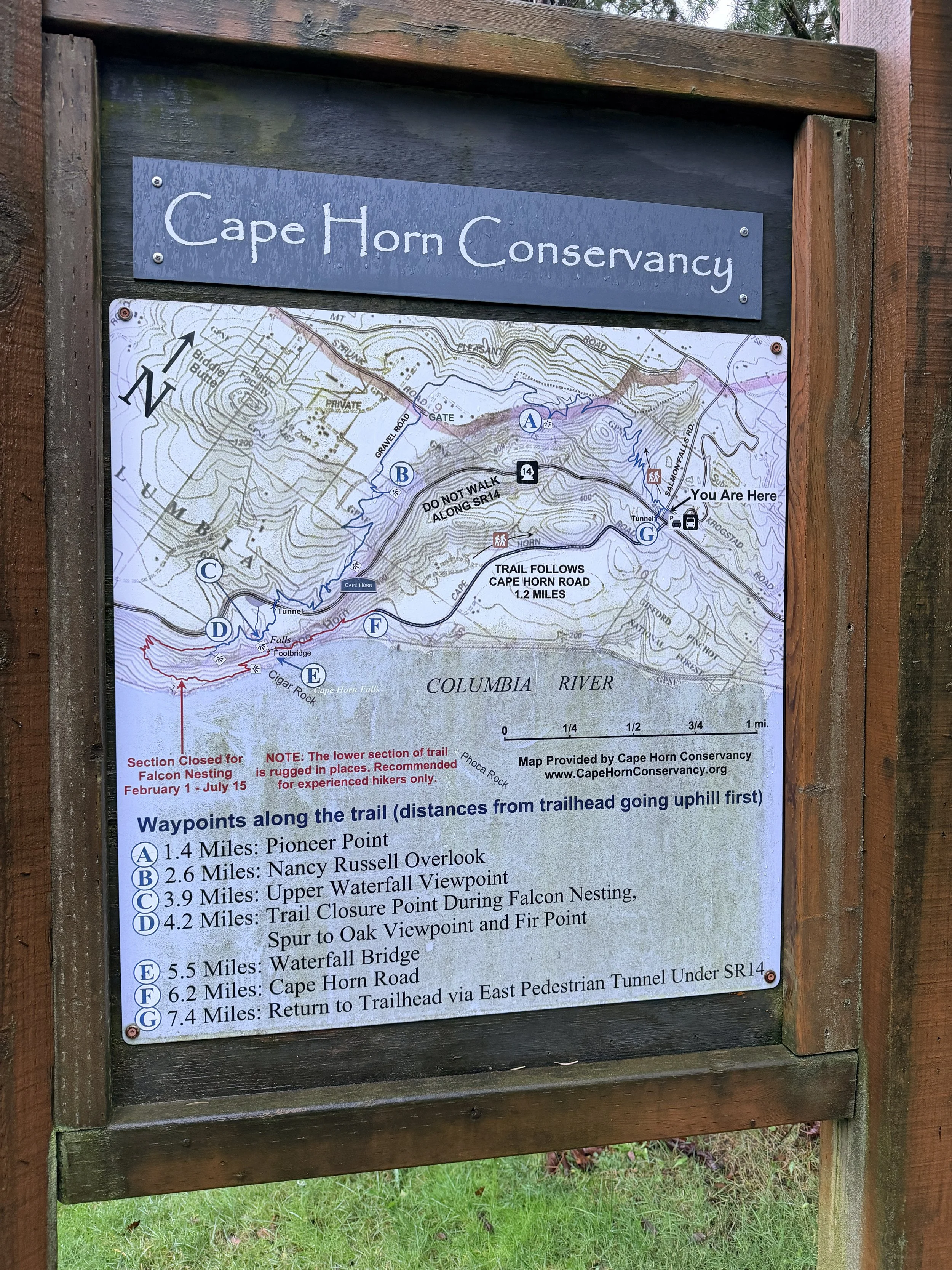 For years I have driven by the various Cape Horn Trail Head parking areas and have always wondered what hike these people were doing. After a little research I planned a winter trip in 2024 but waited to long as the trail is closed form February 1st to July 15th due to nesting Pereguin Falcons.