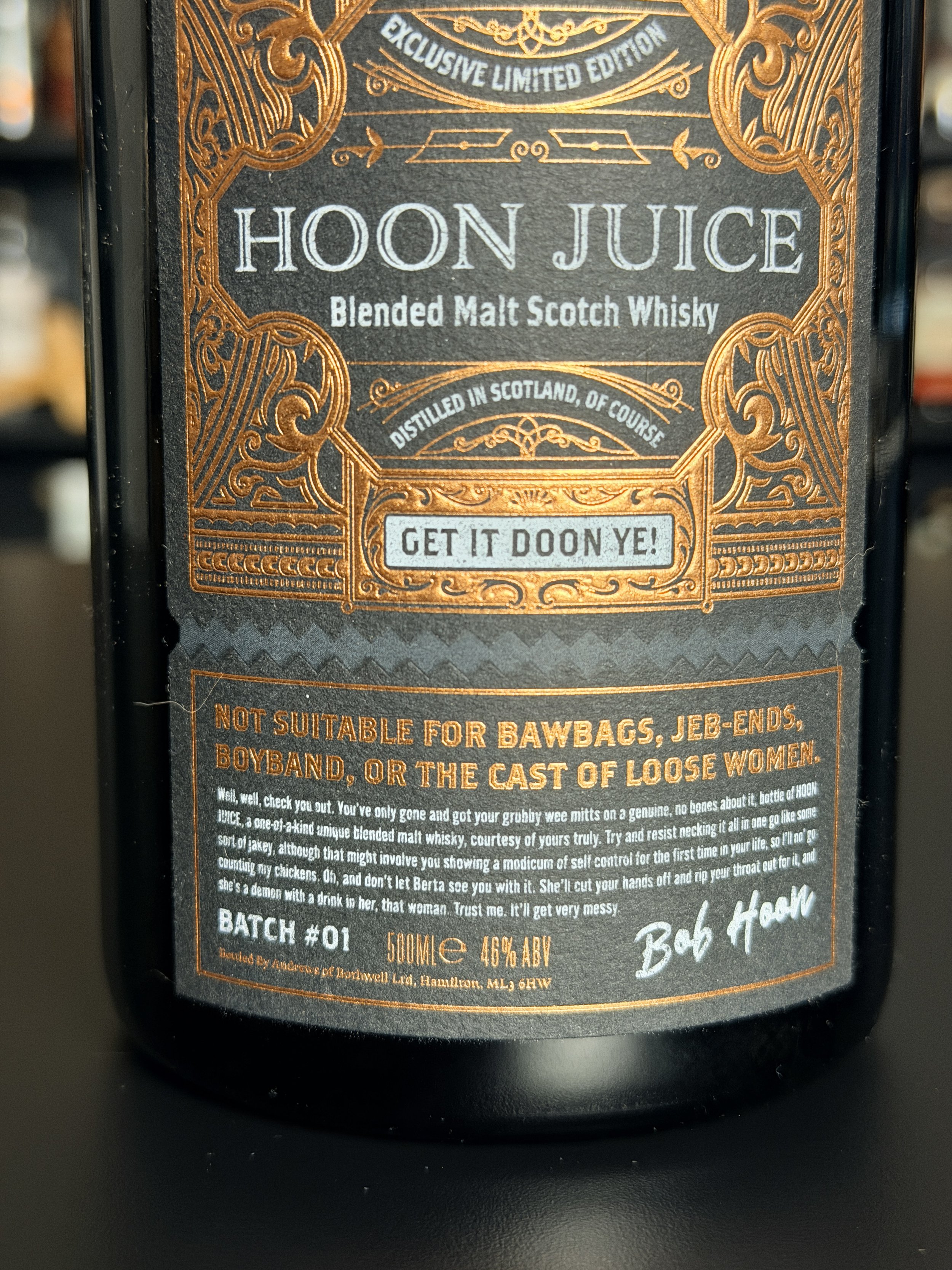 Review: Hoon Juice was gifted to me by a coworker who’s mother purchased the bottle as she was a fan of the book series that featured the fictional character Bob Hoon. The marketing for this bottle is a lot of fun featuring copious amounts of profanity and wit. Sadly the whiskey inside this 500ml black bottle leaves a bit to be desired. It tastes incredibly young and is very very malt forward. That being said it is nice to have a “new make” version of a blended scotch malt so I’m happy it was gifted to me. Cheers!